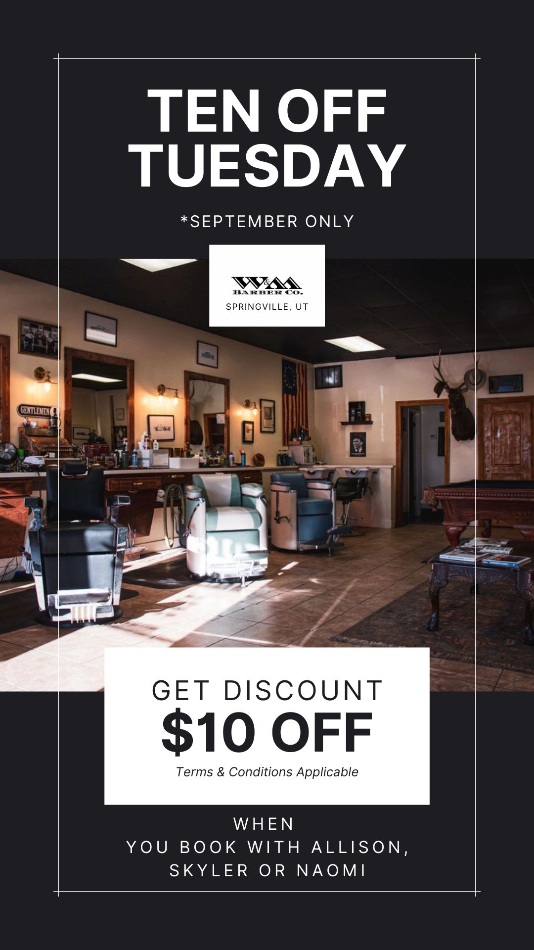 Established in 2019 W&M Barber Co. has been providing quality haircuts and grooming services for over 4 years. The founders started the business with a vision to create a comfortable and relaxing environment for men to get their hair cut. We provide a family safe environment for anyone who is looking for a positive barber experience. Barbering is not just a way to make us money, rather we want to be a staple in our community of Springville, UT. The barbershop we have built up today reflects our love for the barber craft and barbering community. Today, we continue to uphold that tradition and strive to exceed our clients' expectations. Looking for a barber near you? Well look no further!